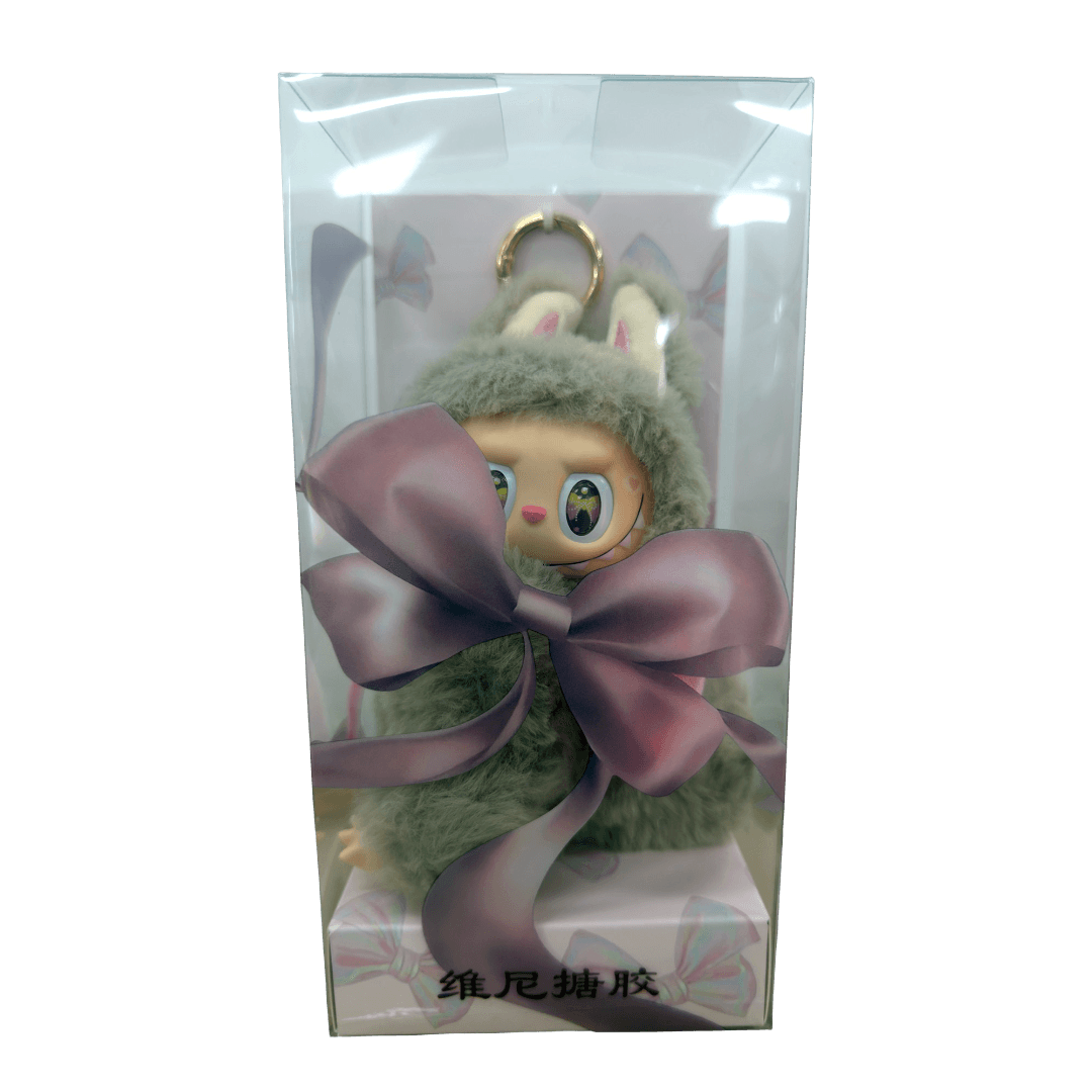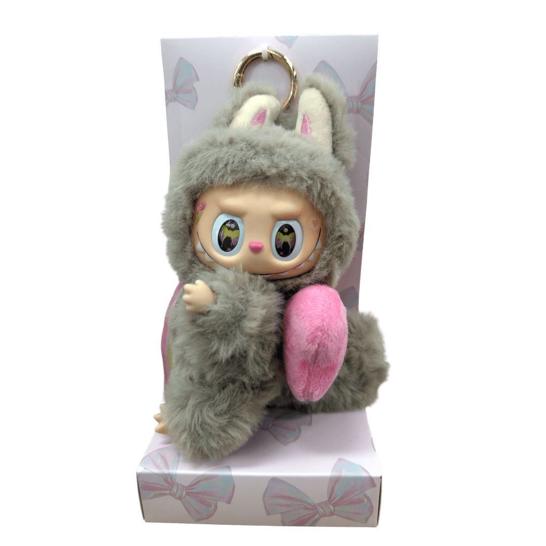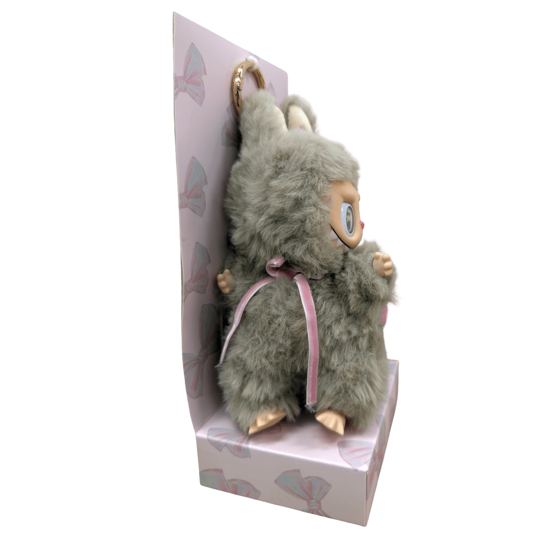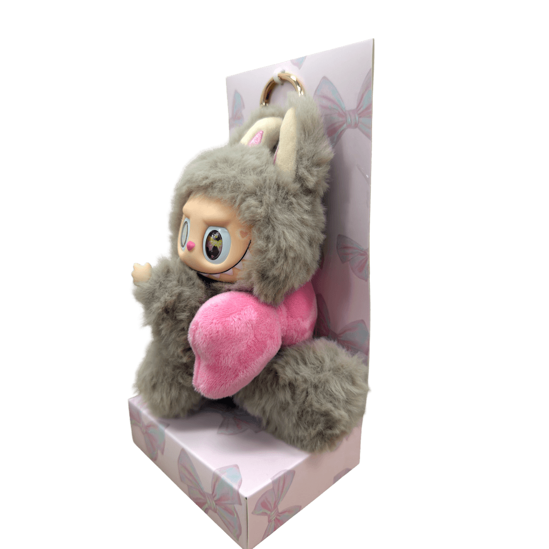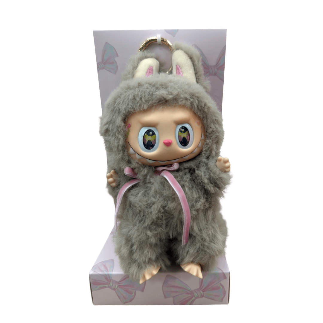 Collector's Delight! The 17CM Vinnie Gray Doll is ultra-soft, featuring striking grey plush fur, an iconic wide-grin vinyl face, and a charming pink velvet bow. A perfect companion or luxury bag charm.